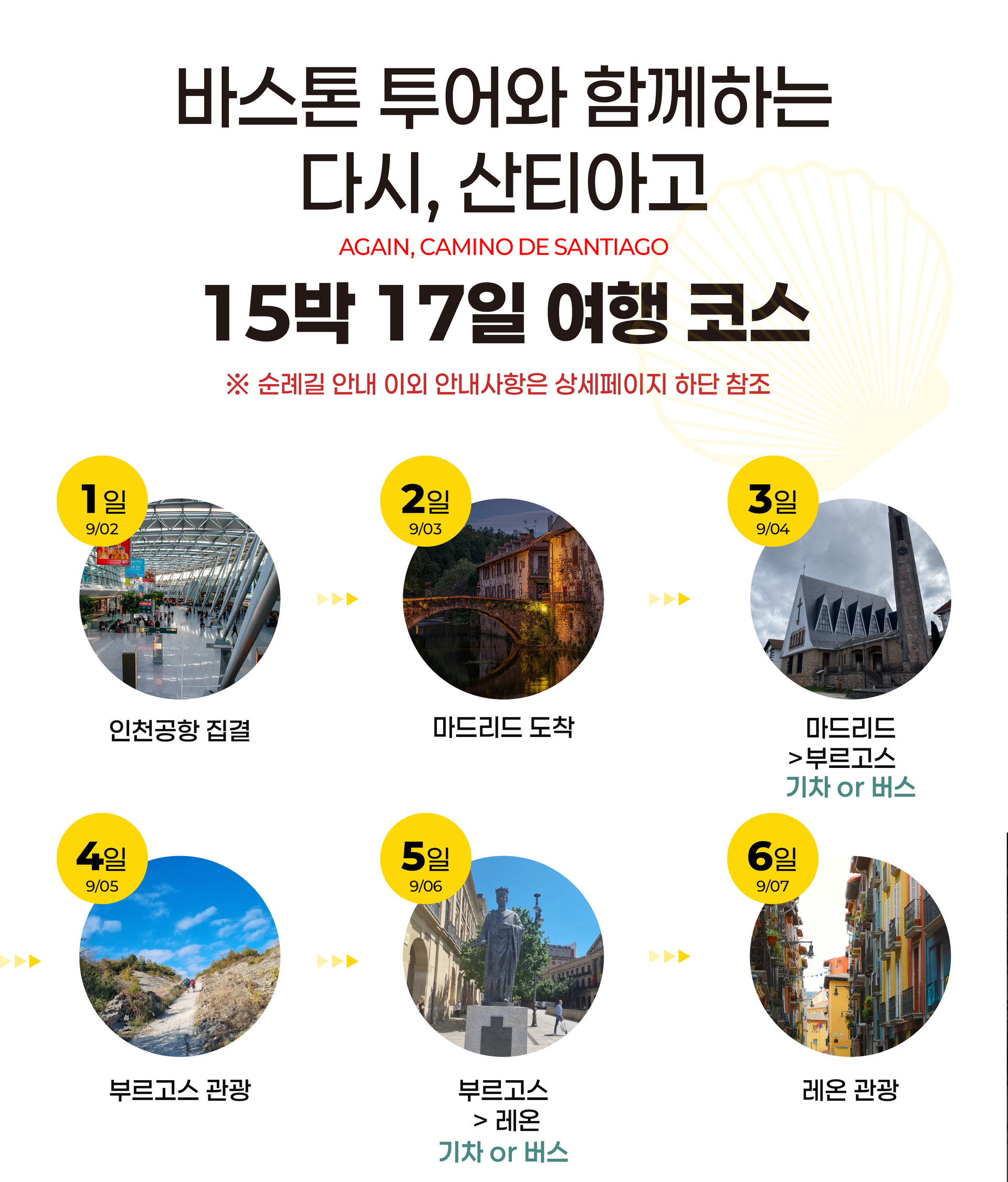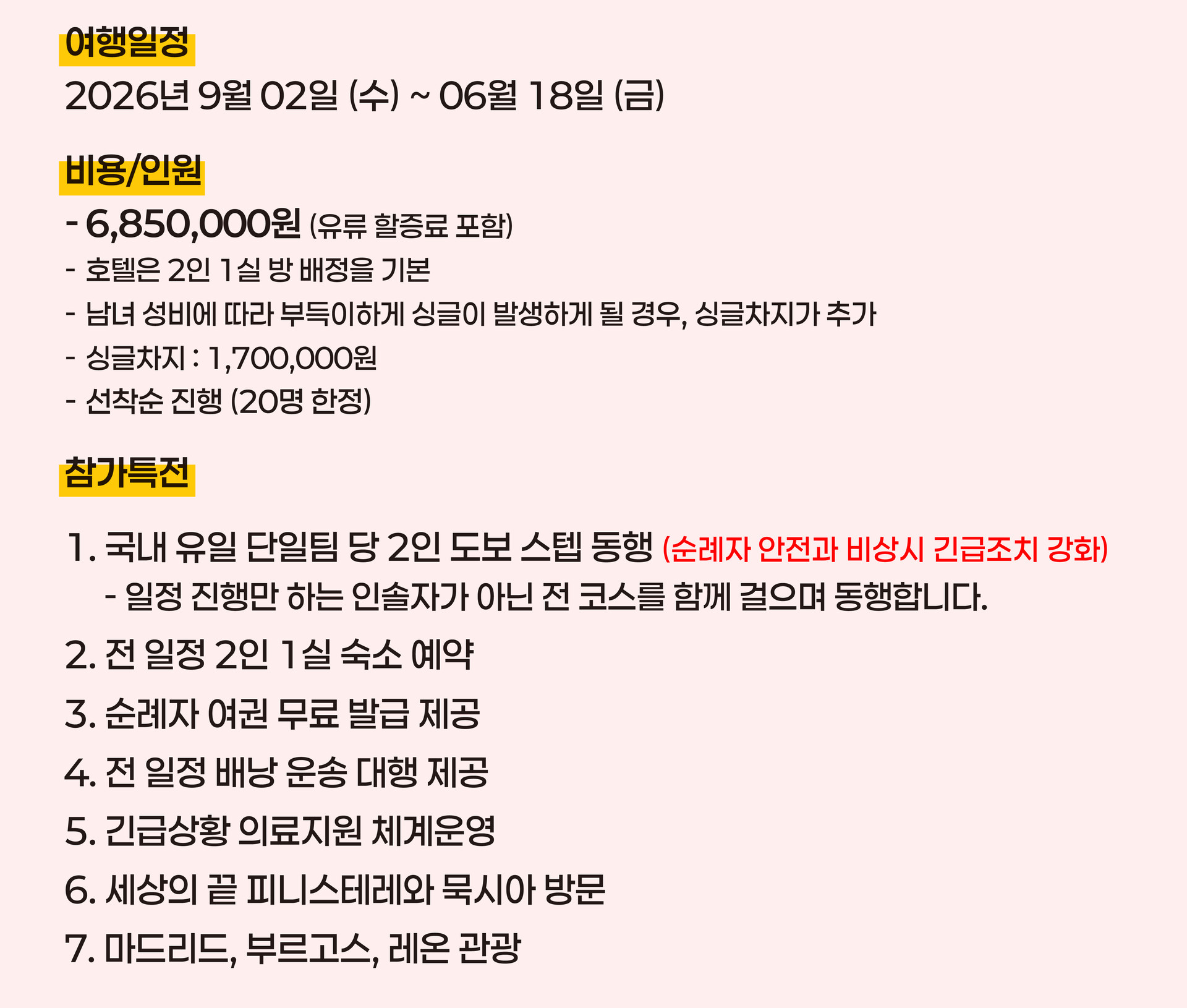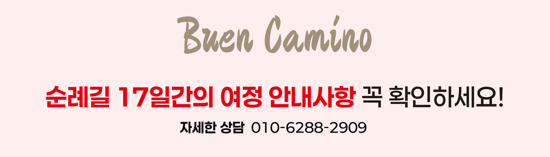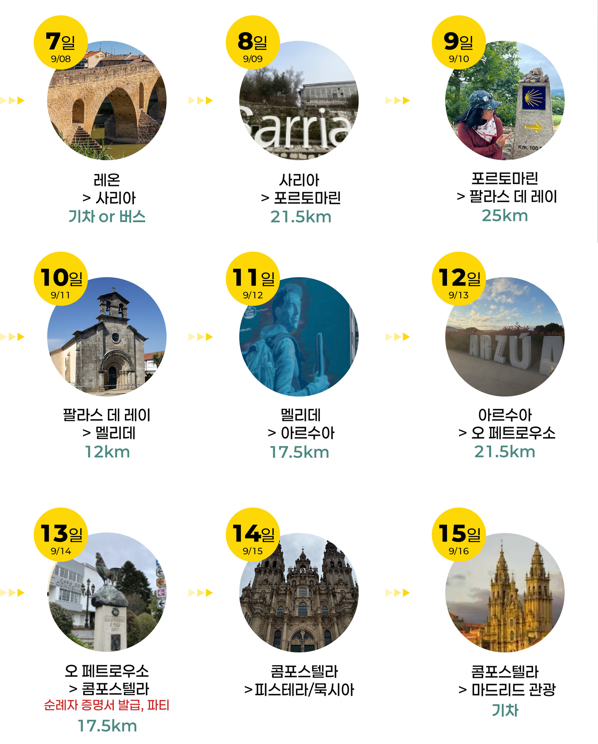 ![]() 일정요약 | 1일차 : 인천 - 마드리드 2일차 : 마드리드 관광 3일차 : 마드리드 - 부르고스 4일차 : 부르고스 관광 5일차 : 부르고스 - 레온 6일차 : 레온 관광 7일차 : 레온 - 사리아 8일차 : 사리아 - 포르토마린 (21.5km) 9일차 : 포르토마린 - 팔라스 데 레이 (25km) 10일차 : 팔라스 데 레이 - 멜리데 (12km) 11일차 : 멜리데 - 아르수아 (17.5km) 12일차 : 아르수아 - 오 페트로우소 (21.5km) 13일차 : 오 페트로우소 - 콤포스텔라(17.5km) 14일차 : 콤포스텔라 - 피스테라/묵시아 15일차 : 콤포스텔라 - 마드리리드 관광 16일차 : 마드리드 자유시간 - 공항 17일차 : 인천 도착 |