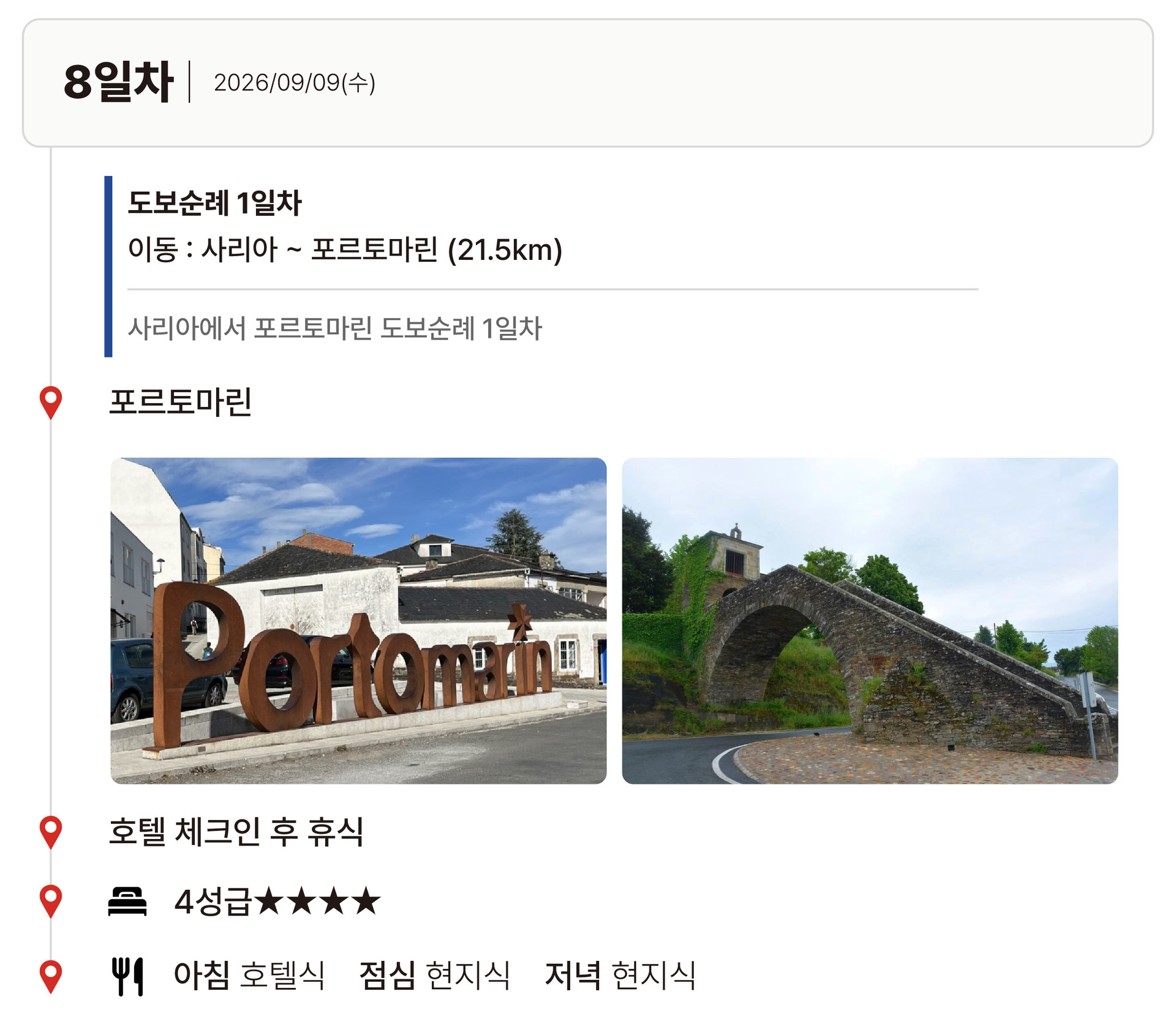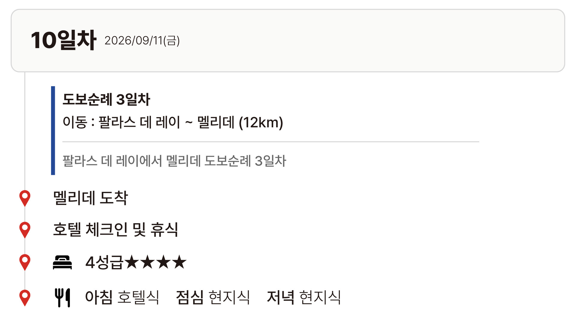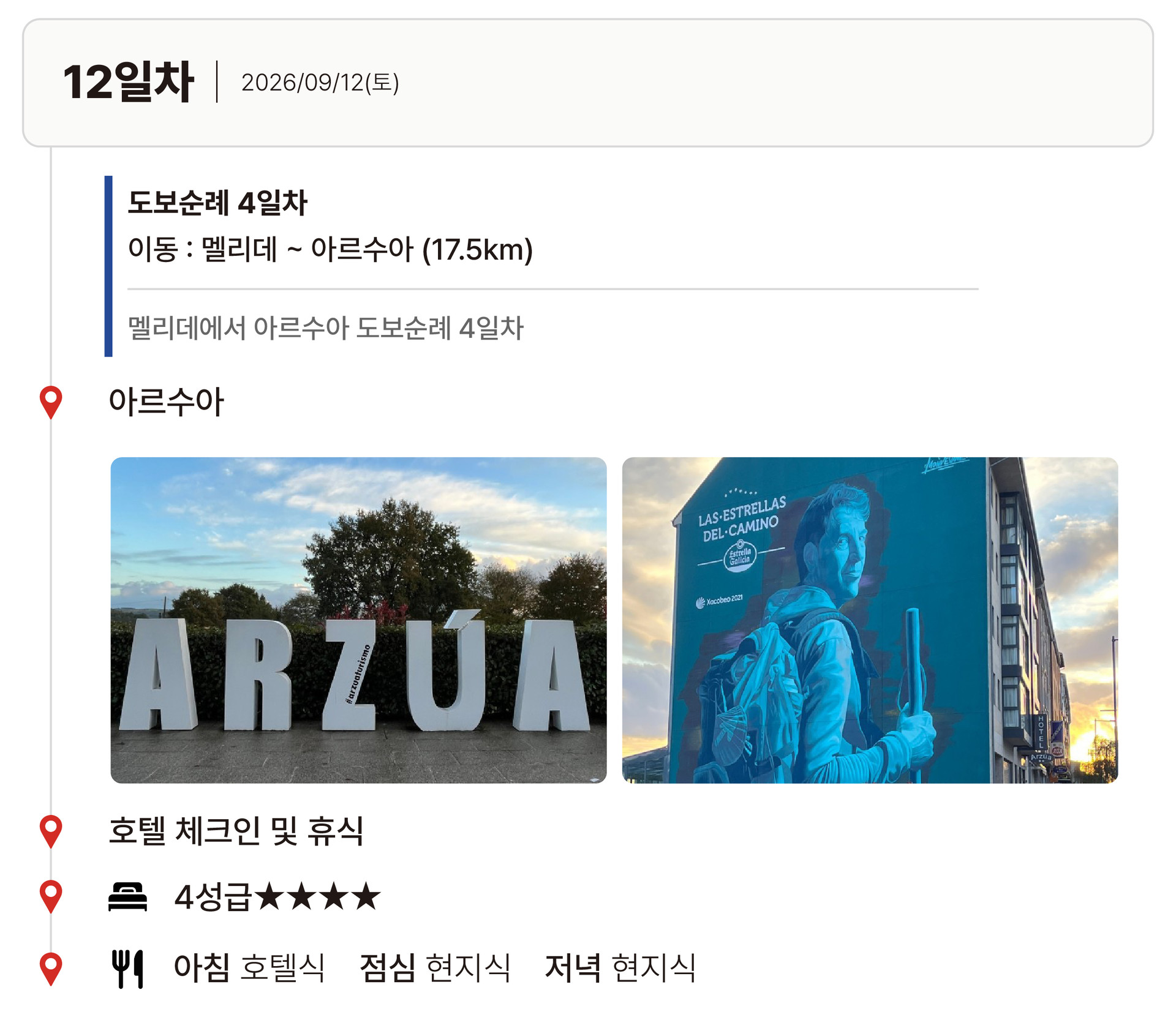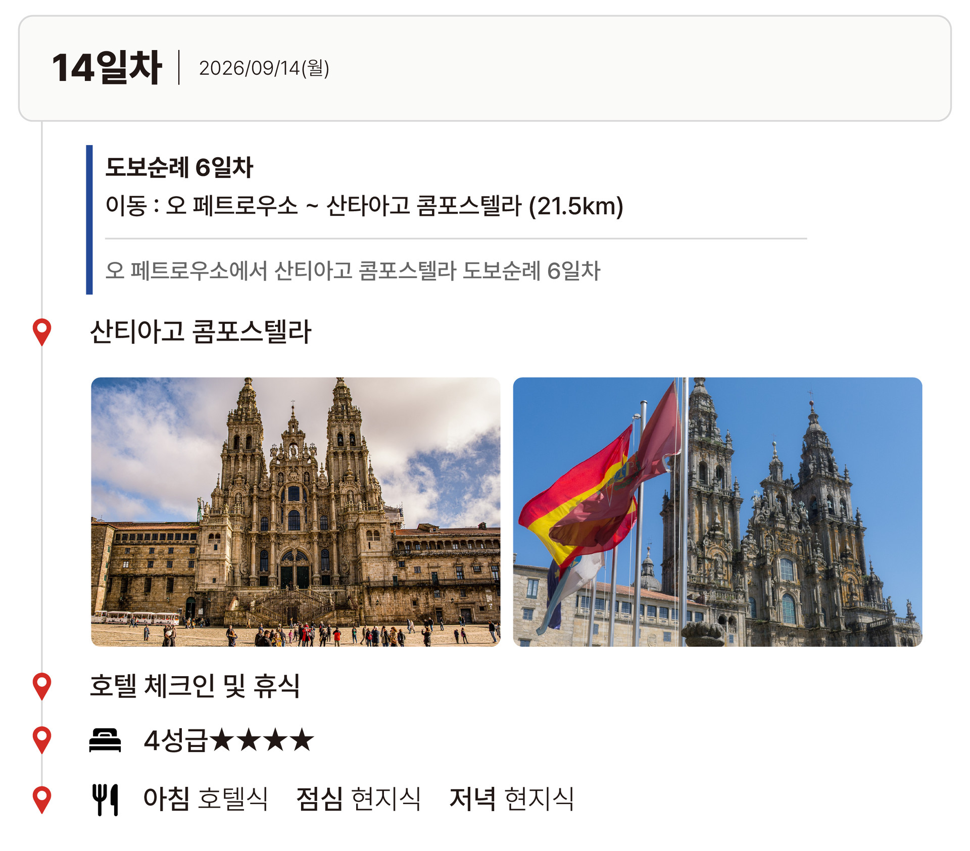 ![]() 일정요약 | 1일차 : 인천 - 마드리드 2일차 : 마드리드 관광 3일차 : 마드리드 - 부르고스 4일차 : 부르고스 관광 5일차 : 부르고스 - 레온 6일차 : 레온 관광 7일차 : 레온 - 사리아 8일차 : 사리아 - 포르토마린 (21.5km) 9일차 : 포르토마린 - 팔라스 데 레이 (25km) 10일차 : 팔라스 데 레이 - 멜리데 (12km) 11일차 : 멜리데 - 아르수아 (17.5km) 12일차 : 아르수아 - 오 페트로우소 (21.5km) 13일차 : 오 페트로우소 - 콤포스텔라(17.5km) 14일차 : 콤포스텔라 - 피스테라/묵시아 15일차 : 콤포스텔라 - 마드리리드 관광 16일차 : 마드리드 자유시간 - 공항 17일차 : 인천 도착 |
