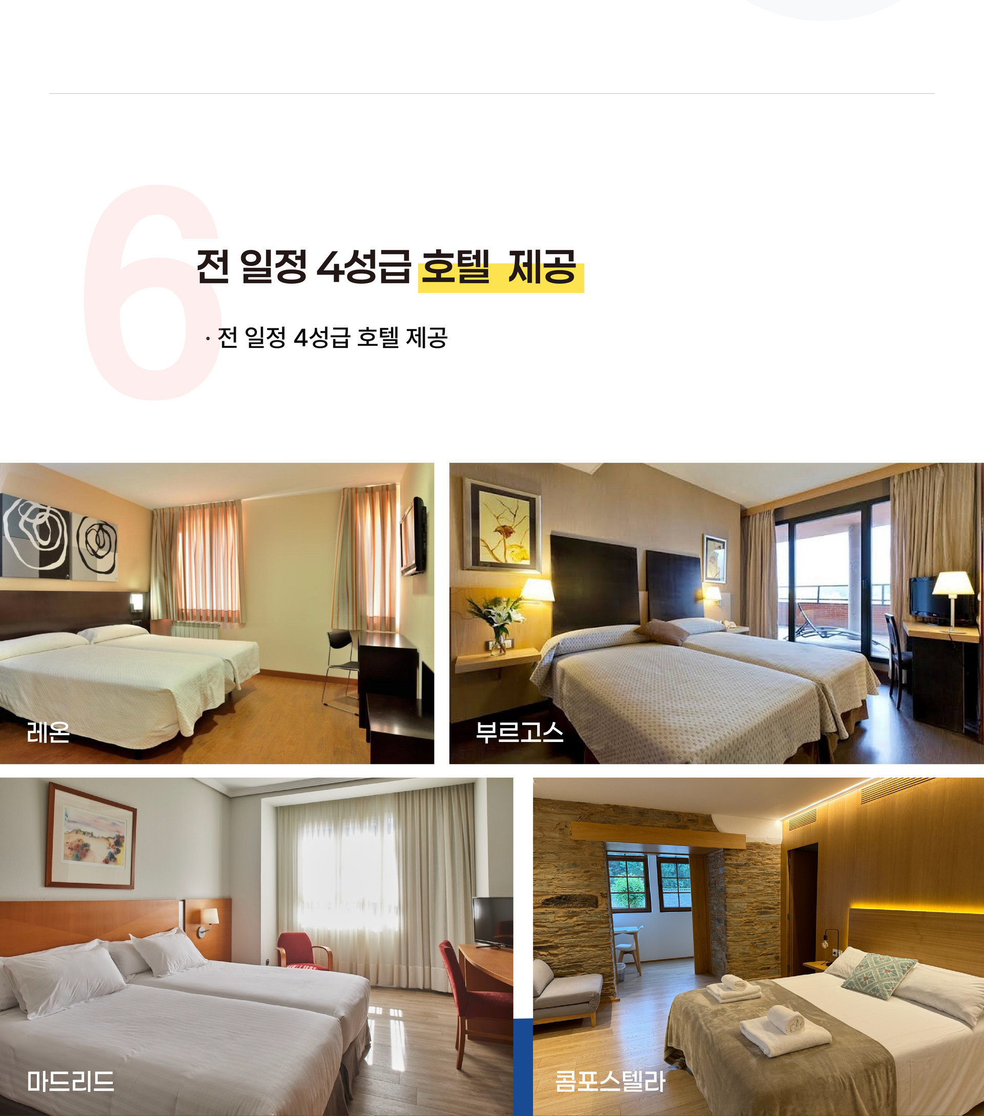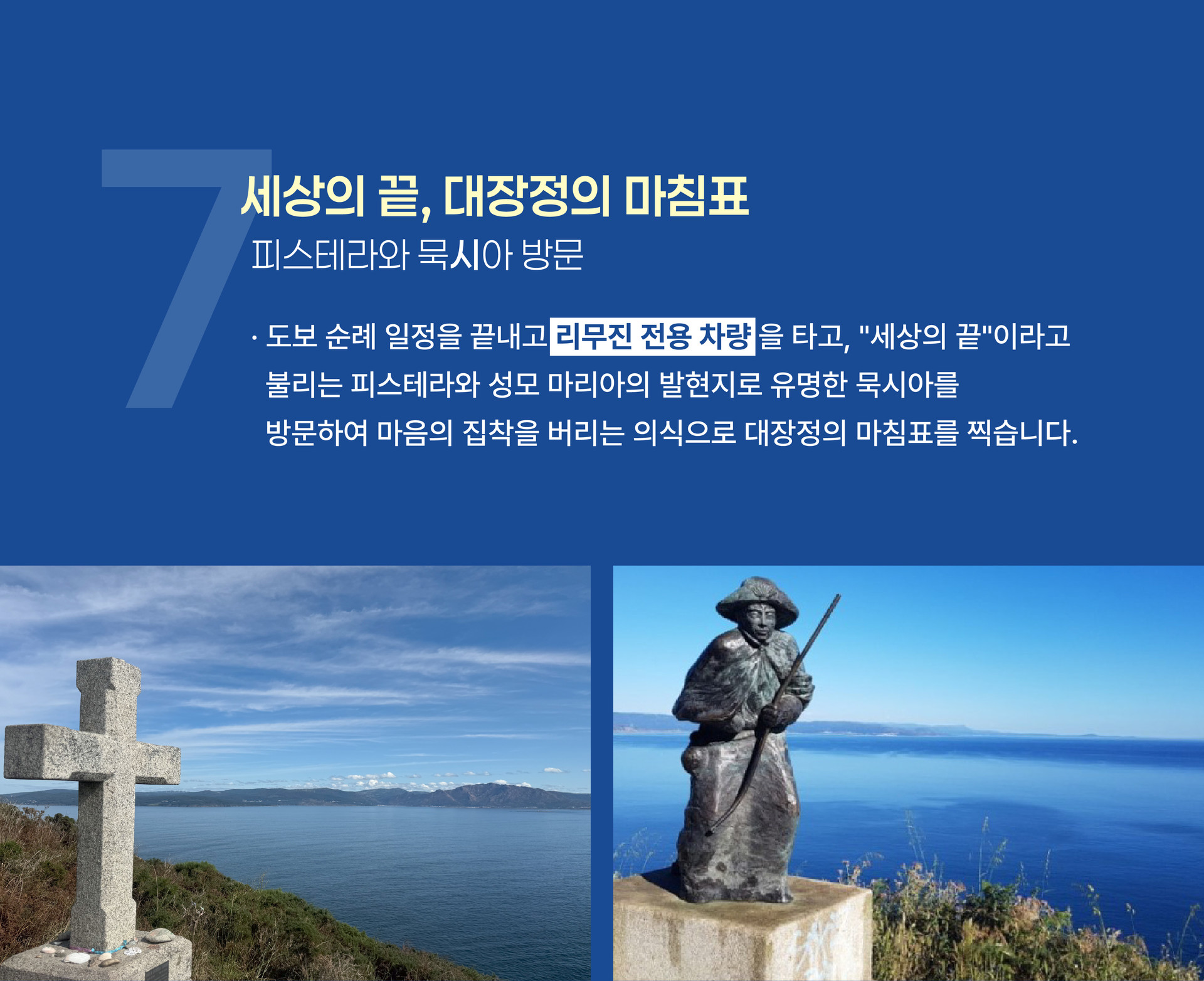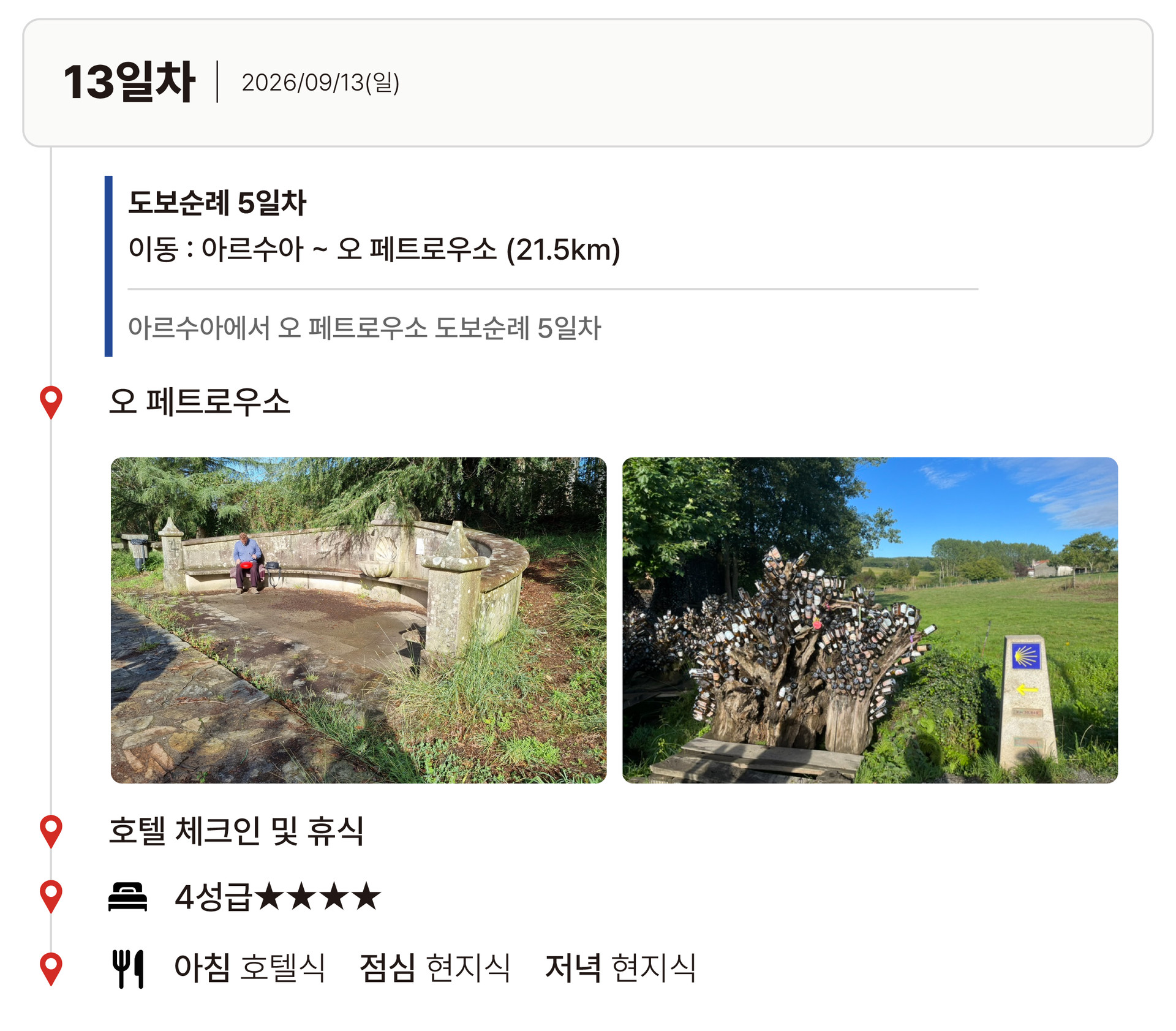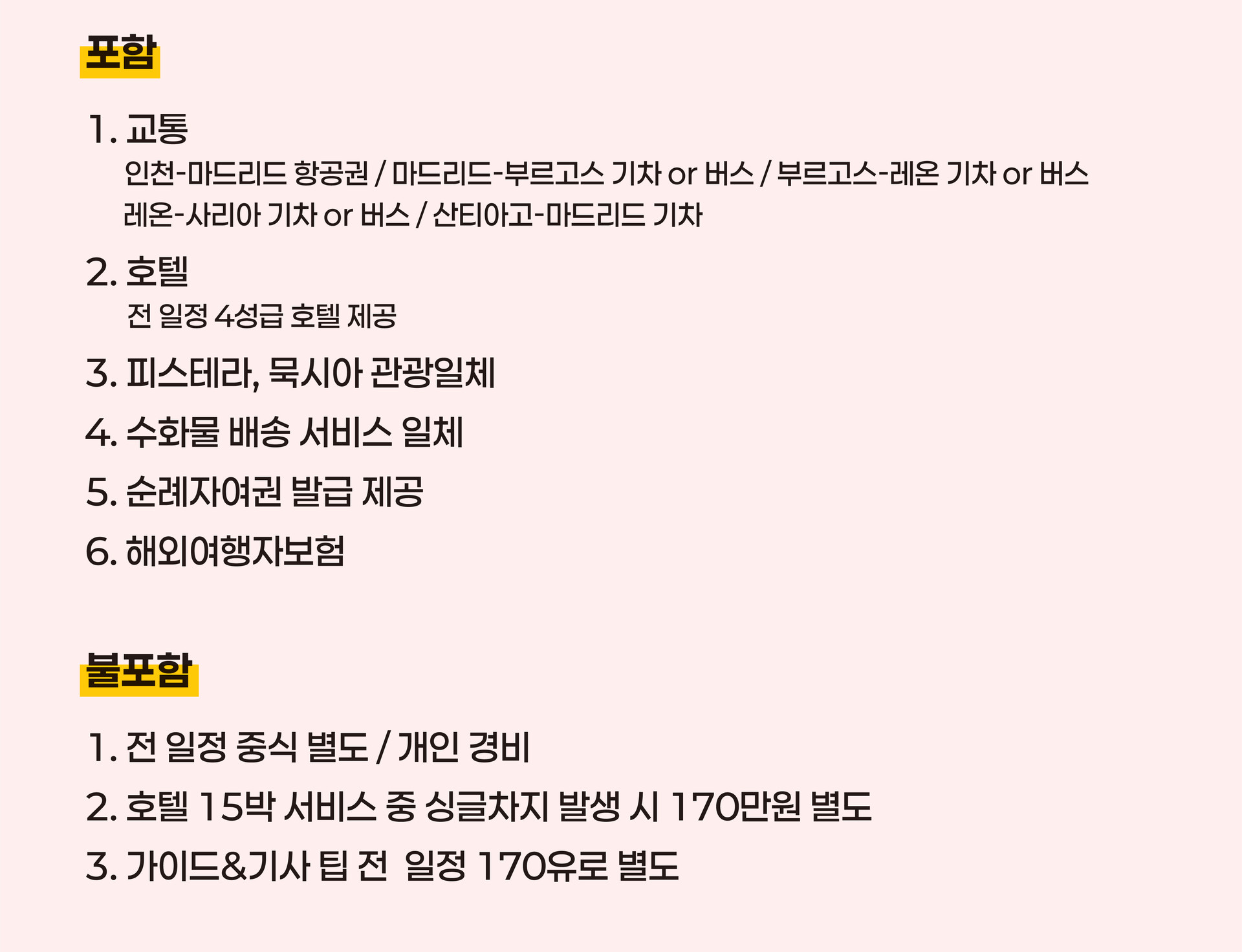 ![]() 일정요약 | 1일차 : 인천 - 마드리드 2일차 : 마드리드 관광 3일차 : 마드리드 - 부르고스 4일차 : 부르고스 관광 5일차 : 부르고스 - 레온 6일차 : 레온 관광 7일차 : 레온 - 사리아 8일차 : 사리아 - 포르토마린 (21.5km) 9일차 : 포르토마린 - 팔라스 데 레이 (25km) 10일차 : 팔라스 데 레이 - 멜리데 (12km) 11일차 : 멜리데 - 아르수아 (17.5km) 12일차 : 아르수아 - 오 페트로우소 (21.5km) 13일차 : 오 페트로우소 - 콤포스텔라(17.5km) 14일차 : 콤포스텔라 - 피스테라/묵시아 15일차 : 콤포스텔라 - 마드리리드 관광 16일차 : 마드리드 자유시간 - 공항 17일차 : 인천 도착 |