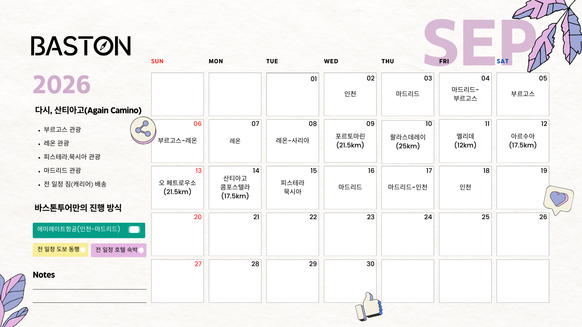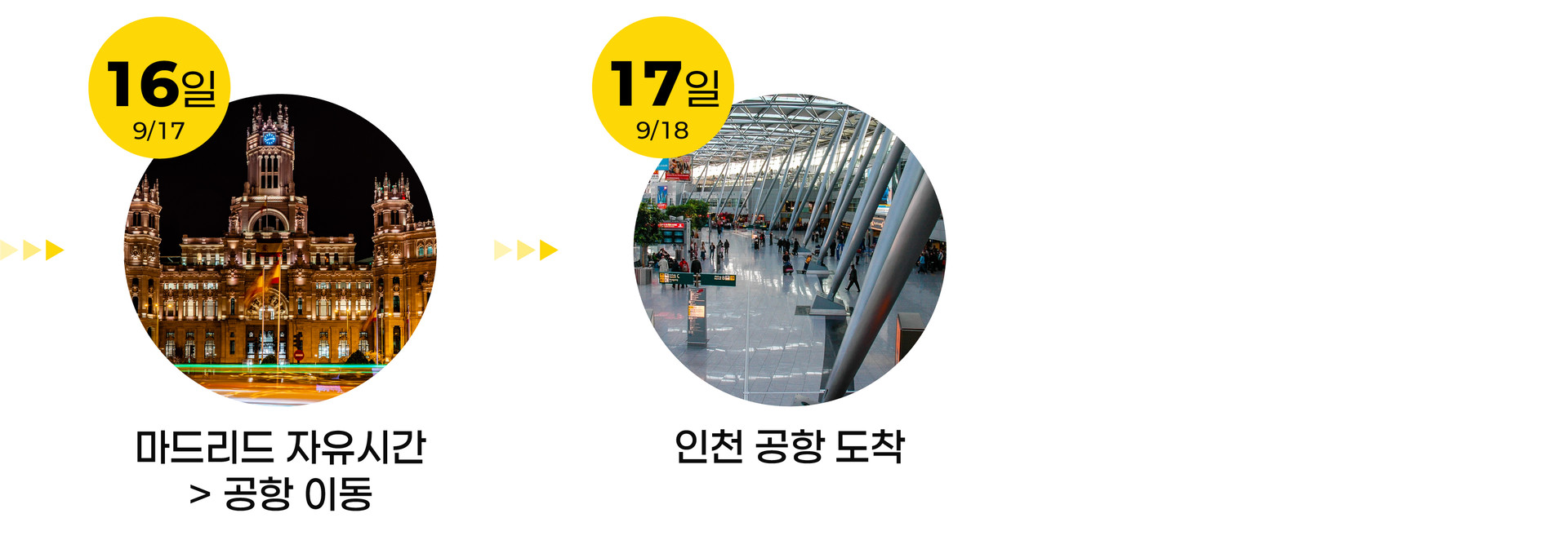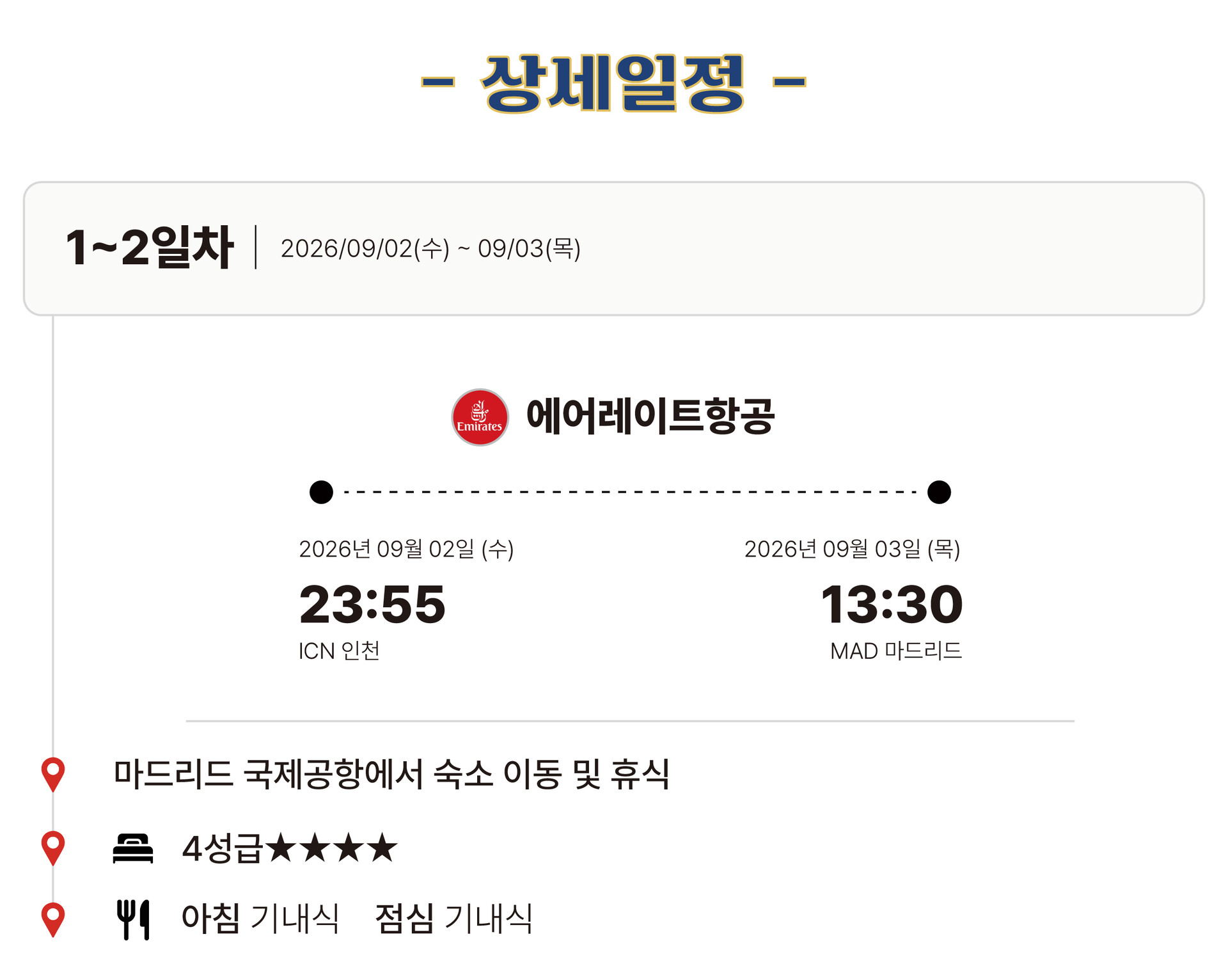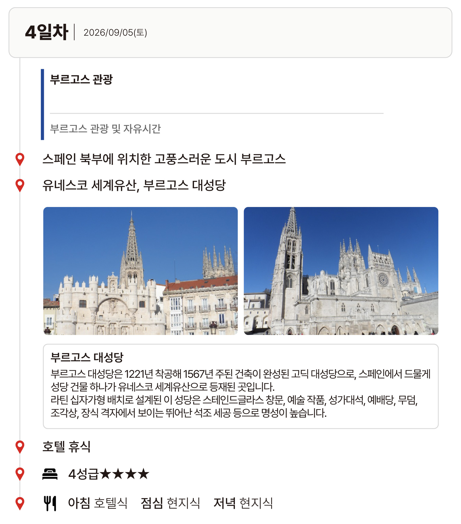 ![]() 일정요약 | 1일차 : 인천 - 마드리드 2일차 : 마드리드 관광 3일차 : 마드리드 - 부르고스 4일차 : 부르고스 관광 5일차 : 부르고스 - 레온 6일차 : 레온 관광 7일차 : 레온 - 사리아 8일차 : 사리아 - 포르토마린 (21.5km) 9일차 : 포르토마린 - 팔라스 데 레이 (25km) 10일차 : 팔라스 데 레이 - 멜리데 (12km) 11일차 : 멜리데 - 아르수아 (17.5km) 12일차 : 아르수아 - 오 페트로우소 (21.5km) 13일차 : 오 페트로우소 - 콤포스텔라(17.5km) 14일차 : 콤포스텔라 - 피스테라/묵시아 15일차 : 콤포스텔라 - 마드리리드 관광 16일차 : 마드리드 자유시간 - 공항 17일차 : 인천 도착 |