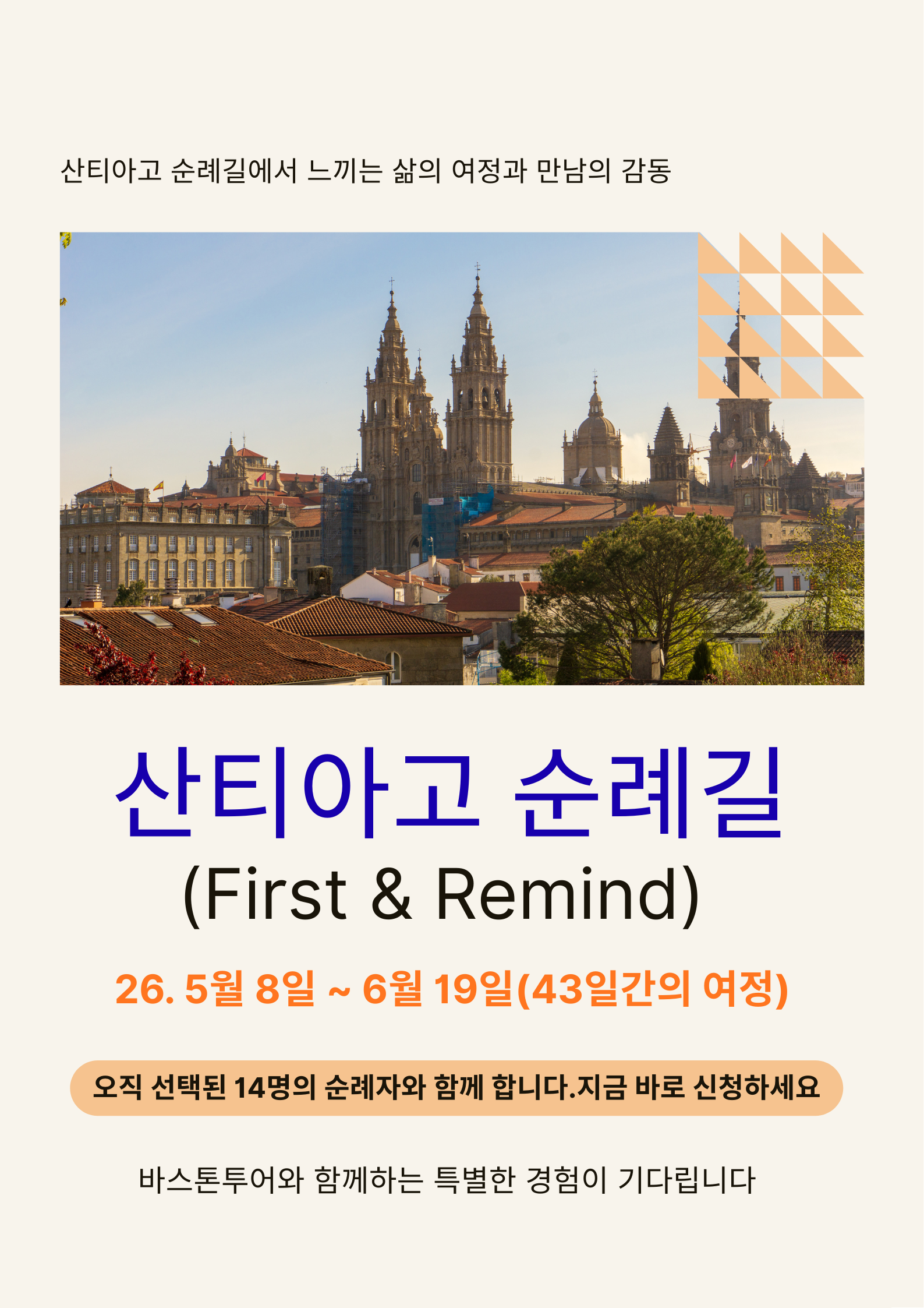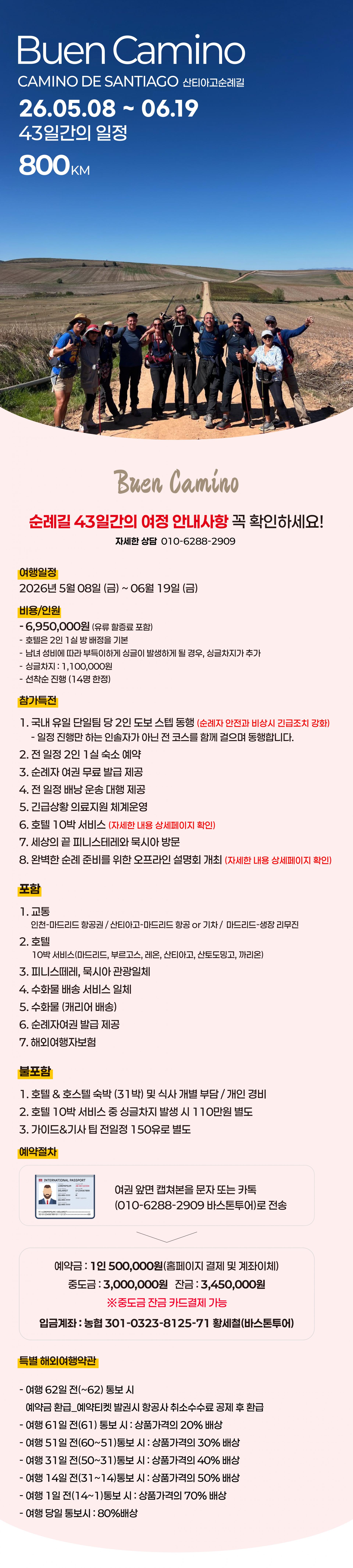 | 참가 특전 | 1. 국내 유일 단일팀 당 2인 스텝 동행 (순례자 안전과 비상시 긴급조치 강화) - 일정 진행만 하는 인솔자가 아닌 전 코스를 함께 걸으며 동행합니다. - 매일 아침 건강체크 및 준비운동 후 출발 2. 순례 기간 2인 1실 숙소 예약 3. 순례자여권 무료 대행 발급(한국에서 미리 발급받아 출발 전 지급해 드립니다.) 4. 전 일정 배낭 운송 제공 5. 긴급상황 의료지원 체계운영 6. 호텔 10박 서비스 (마드리드 2박,부르고스2박,레온2박,산티아고 콤포스텔라2박,산토도밍고1박,까리온데로스콘데스1박) 7. 호텔 10박 서비스 중 파라도르 국영호텔 2박 서비스 포함 8. 세상의 끝 피니스테레와 묵시아 방문 9. 완벽한 순례 준비를 위한 오프라인 설명회 개최(자세한 내용 상세페이지 확인) |