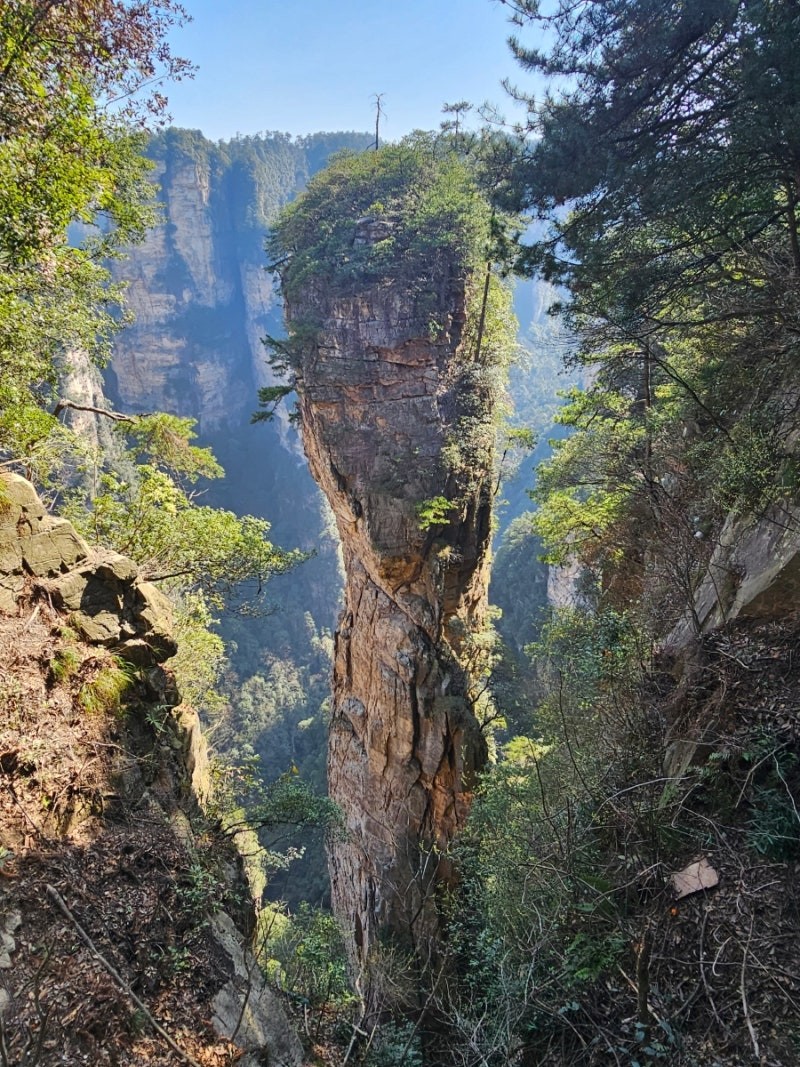 원가계는 영화 아바타의 촬영지로 유명하며, 협곡 양쪽으로 무성한 숲과 기괴한 모양들의 봉우리가 펼쳐져 있는 곳입니다.