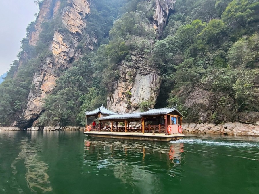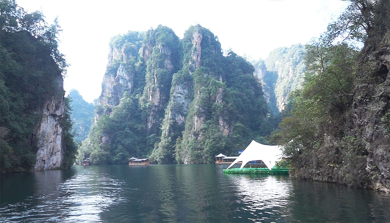보봉호를 위에서 내려보면, 산이 마치 비취를 품고 있는 모양새라 하여 장가계의 비취라고도