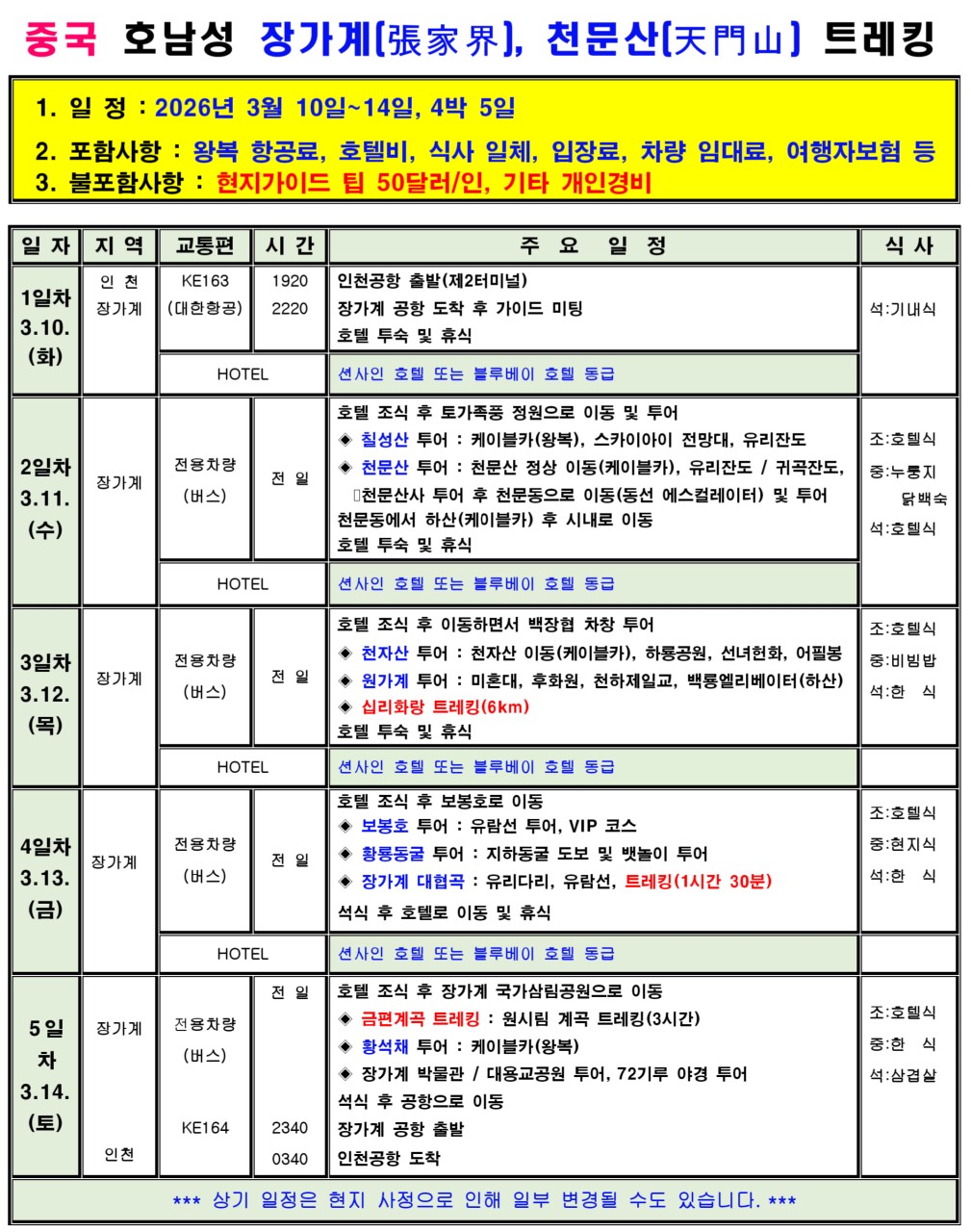 | 포함/불포함 | ▶ 포함 1. 교통 : 인천-장가계 항공권(대한항공) 2. 숙박 : 호텔 4박(4성급) 3. 전 일정 식사비 4. 전 일정 교통비 5. 관광지 입장료 6. 해외여행자보험 ▶ 불포함 . 개인경비 , 매너팁 , 가이드팁(인당 50달러) |
