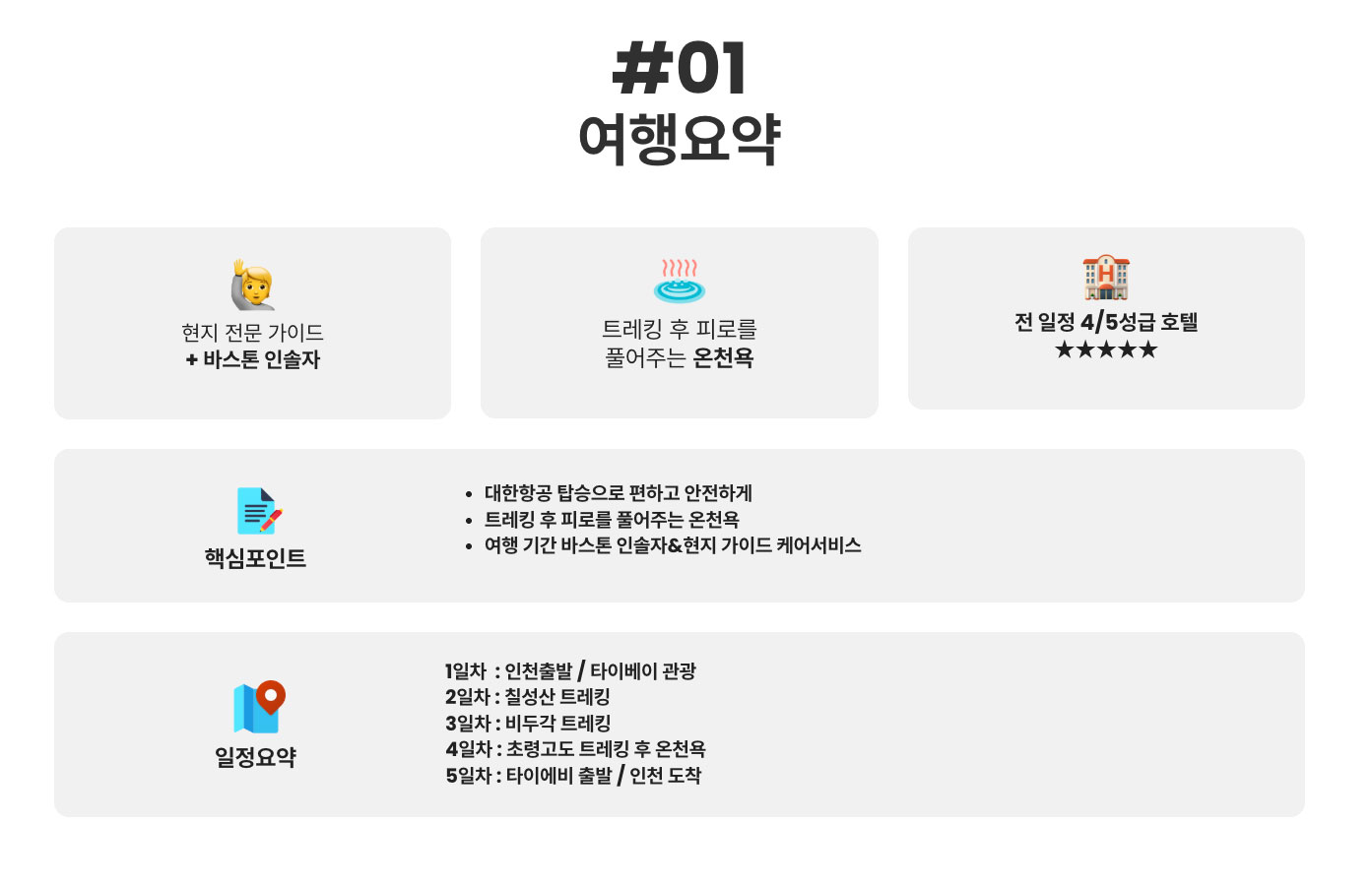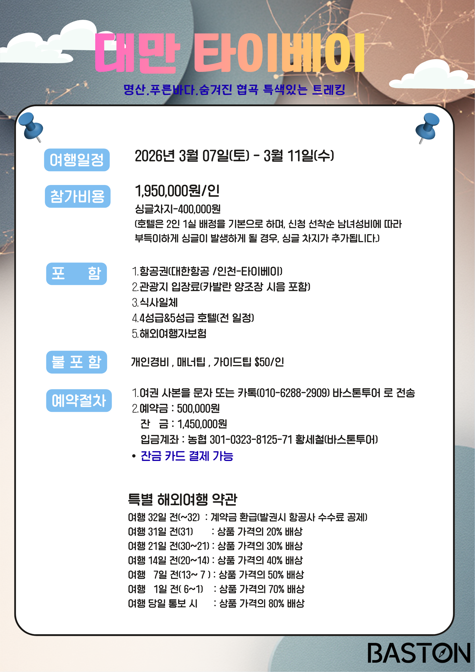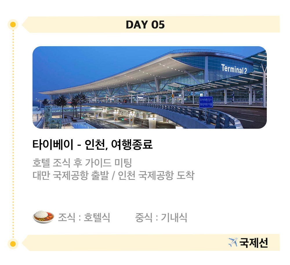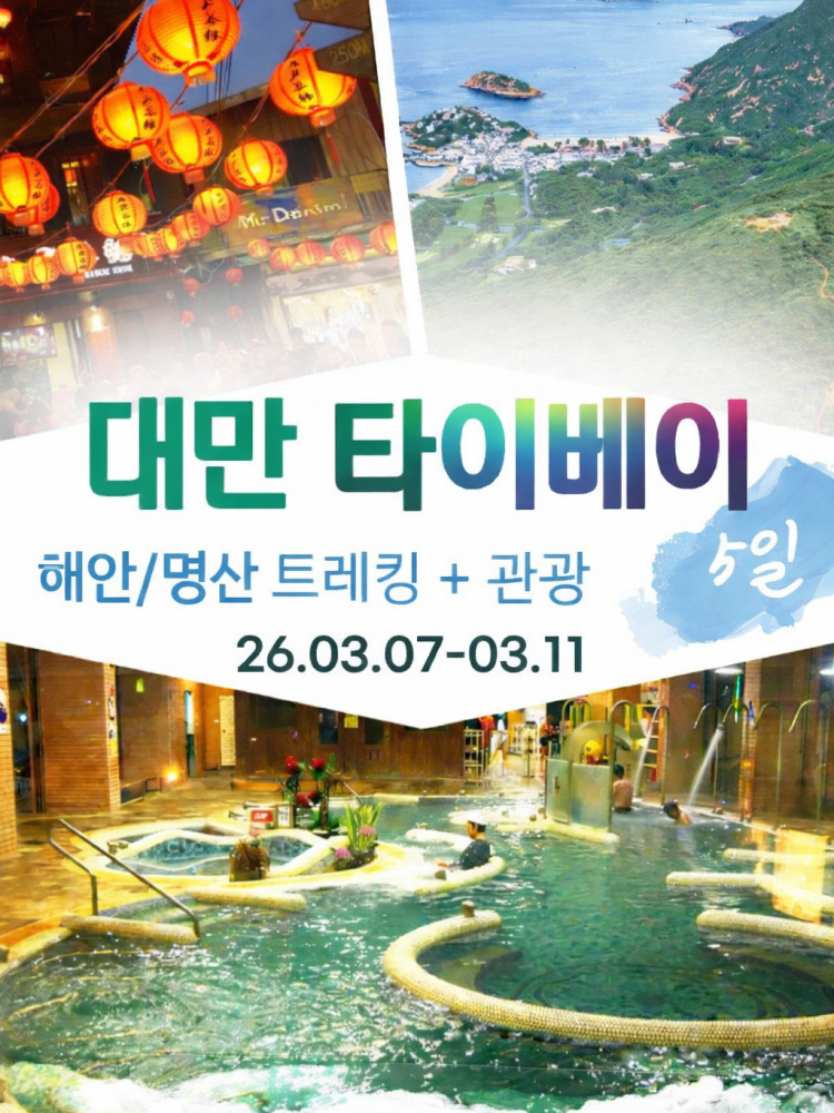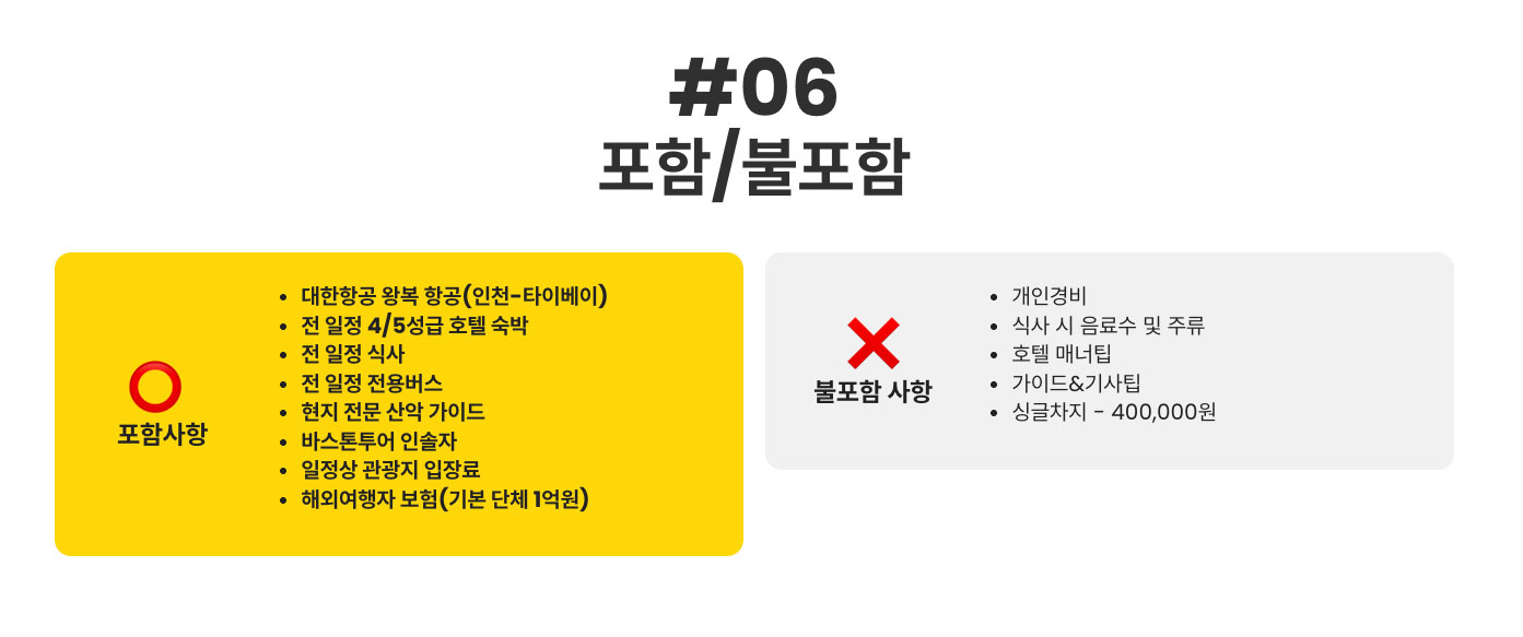 | 포함/불포함 | ▶ 포함 1. 교통 : 인천-타이베이 항공권(대한항공) 2. 숙박 : 호텔 4박(4성&5성급) 3. 전 일정 식사비 4. 전 일정 교통비 5. 관광지 입장료 6. 해외여행자보험 ▶ 불포함 . 개인경비 , 매너팁 , 가이드팁(인당 50달러) |