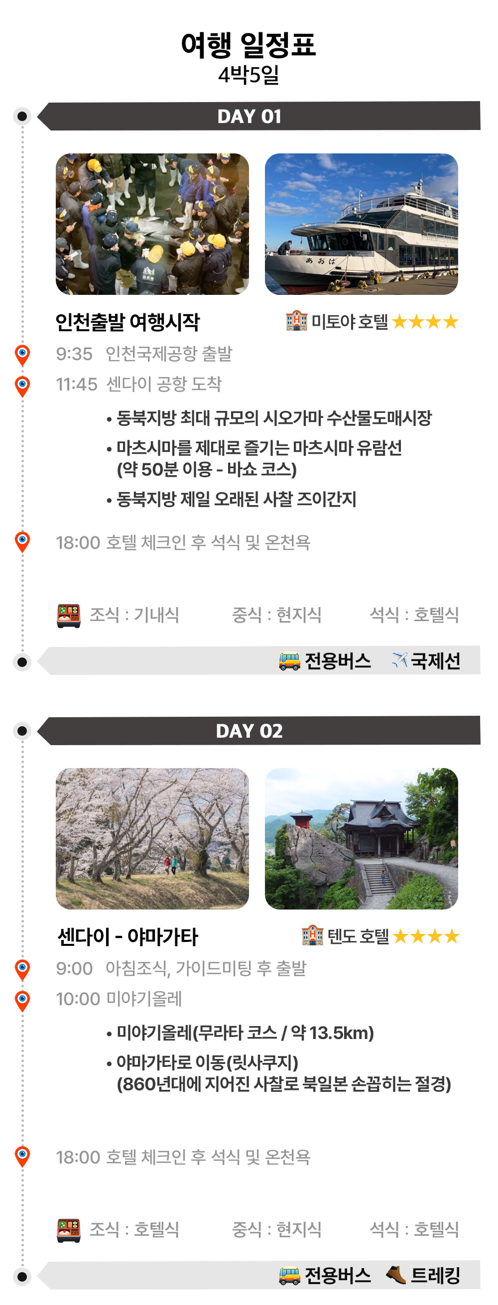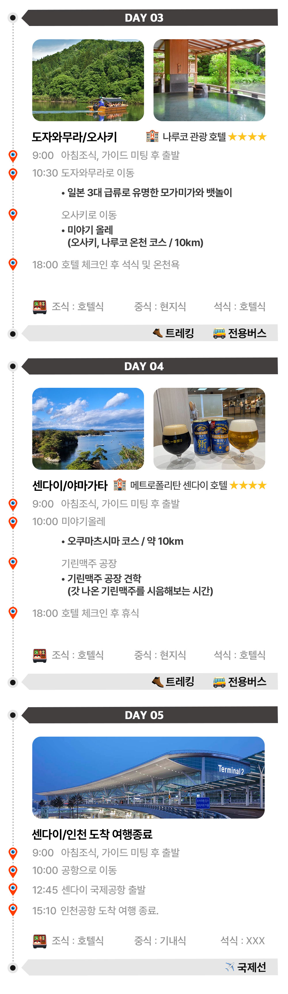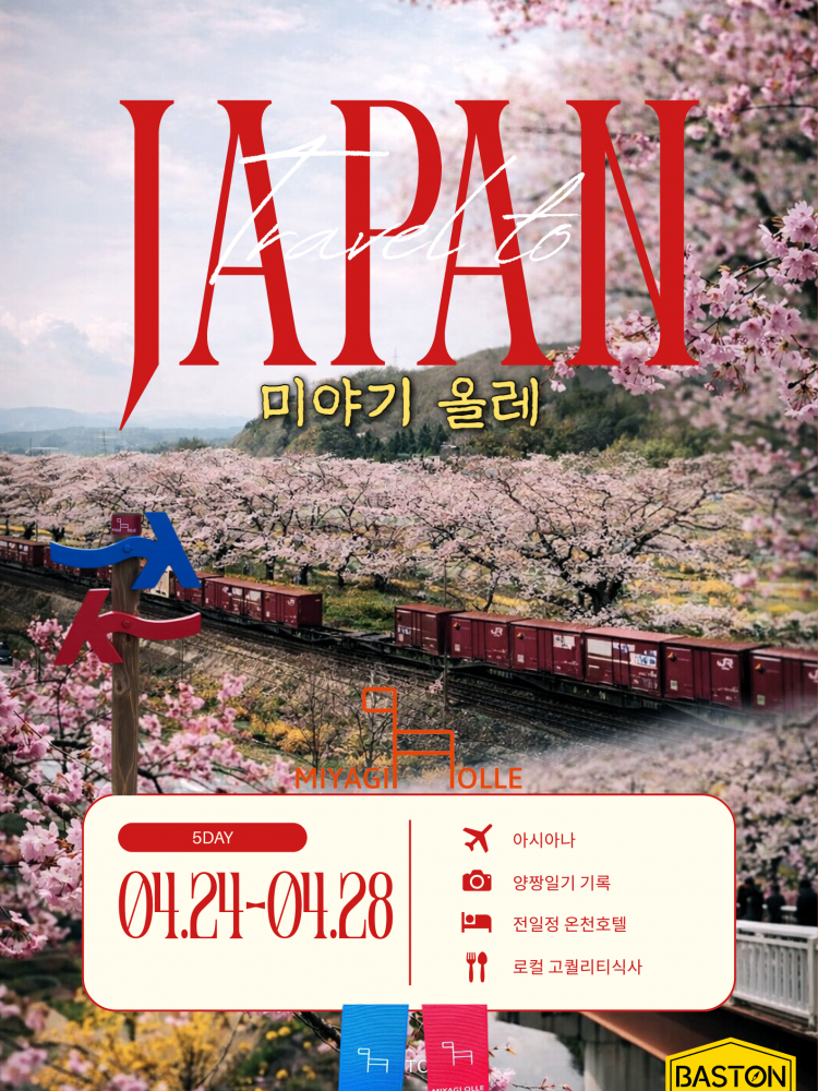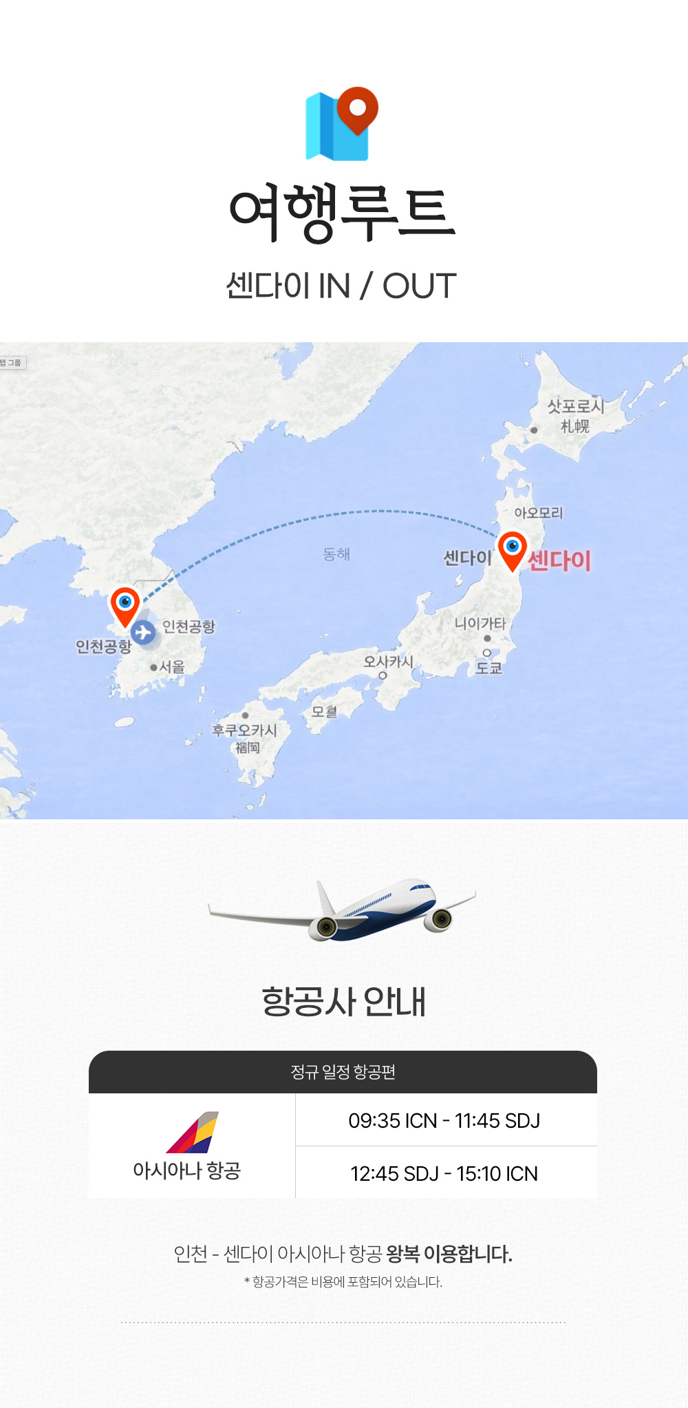 | 포함/불포함 | ▶ 포함 1. 교통 : 인천-센다이 항공권(아시아나항공) 2. 숙박 : 호텔 4박(전 일정 특급 호텔) 3. 전 일정 식사비 4. 전 일정 교통비 5. 관광지 입장료 6. 해외여행자보험 ▶ 불포함 . 개인경비 , 매너팁 , 가이드팁(인당 50달러) |