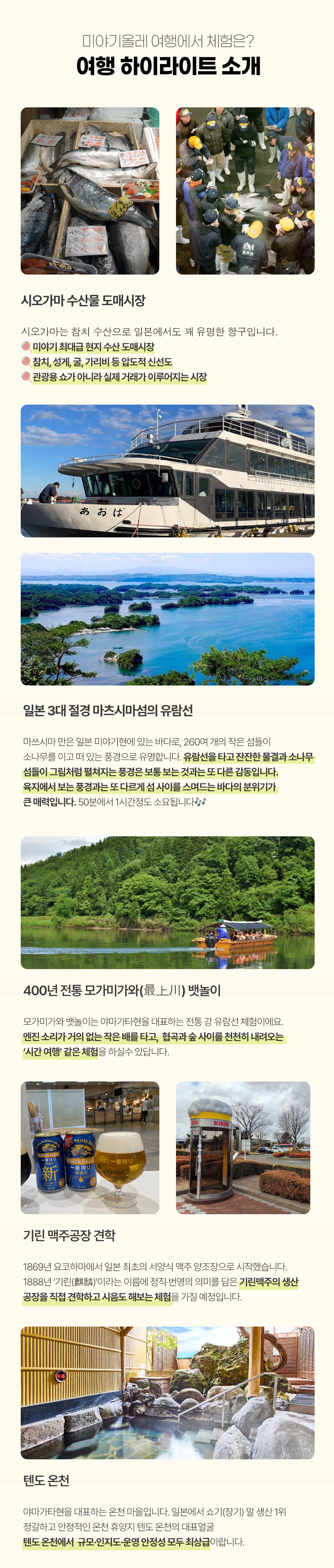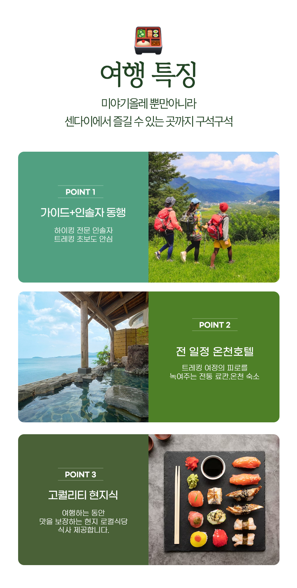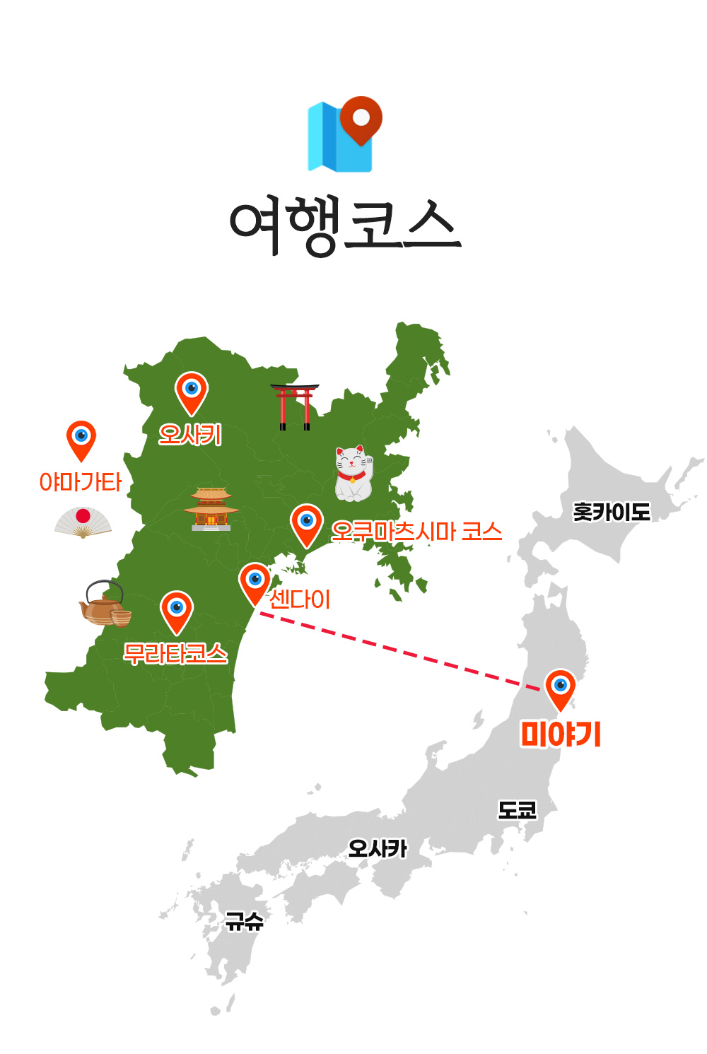 | 포함/불포함 | ▶ 포함 1. 교통 : 인천-센다이 항공권(아시아나항공) 2. 숙박 : 호텔 4박(전 일정 특급 호텔) 3. 전 일정 식사비 4. 전 일정 교통비 5. 관광지 입장료 6. 해외여행자보험 ▶ 불포함 . 개인경비 , 매너팁 , 가이드팁(인당 50달러) |