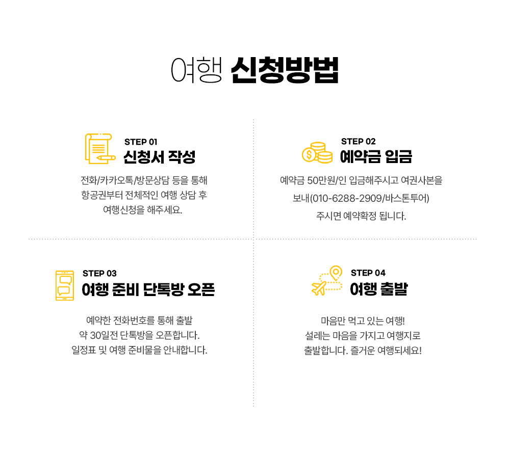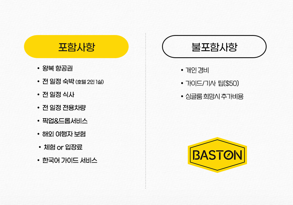 | 예약절차 | 1. 여권 앞면 캡쳐본을 문자 또는 카톡(010-6288-2909 바스톤투어)로 전송 2. 예약금 : 500,000원/인 (홈페이지 결제 및 계좌이체) 잔 금 : 1,990,000원(카드 결제가능) 입금계좌 : 301-0323-8125-71 입금은행 및 예금주 : 농협 / 황세철(바스톤투어) ▶특별 해외여행약관 - 여행 32일 전(~32) 통보 시 : 예약금 환급_항공권 발권시 항공사 취소수수료 공제 후 환급 - 여행 31일 전(31) 통보 시 : 상품가격의 20% 배상 - 여행 21일 전(30~21)통보 시 : 상품가격의 30% 배상 - 여행 14일 전(20~14)통보 시 : 상품가격의 40% 배상 - 여행 7일 전(13~7)통보 시 : 상품가격의 50% 배상 - 여행 1일 전(6~1)통보 시 : 상품가격의 70% 배상 - 여행 당일 통보시 : 80%배상 |