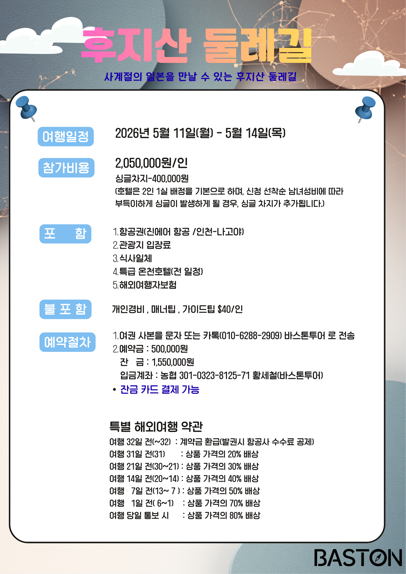 💬 여행상담 010-6288-2909 | 🗓️ 입금계좌 : 농협 301-0323-8125-71 황세철(바스톤투어) |